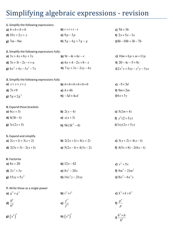 Simplifying Algebraic Expressions Revision Teaching Resources